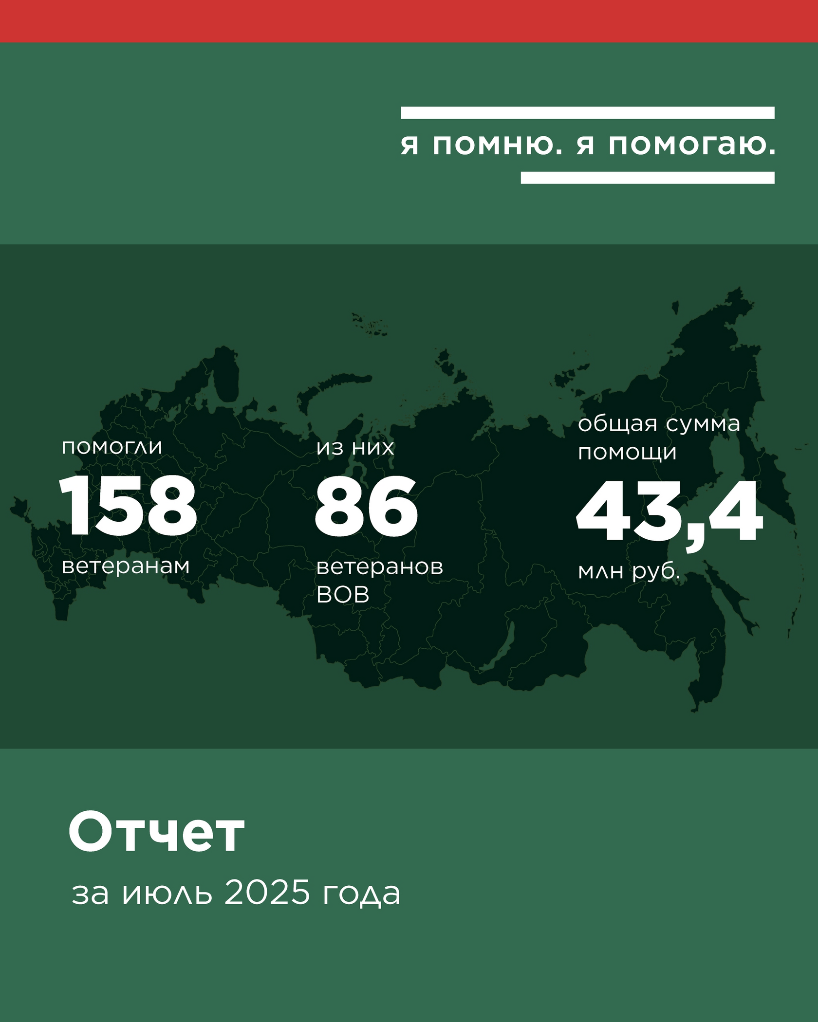 Весь июль мы помогали ветеранам! Оказали помощь на 43,4 миллиона рублей 158 ветеранам, из которых 86 — Великой Отечественной войны, и не планируем останавливаться!
